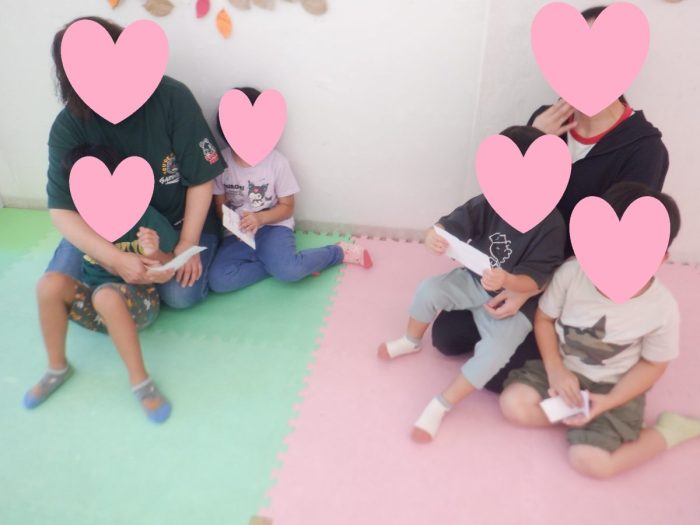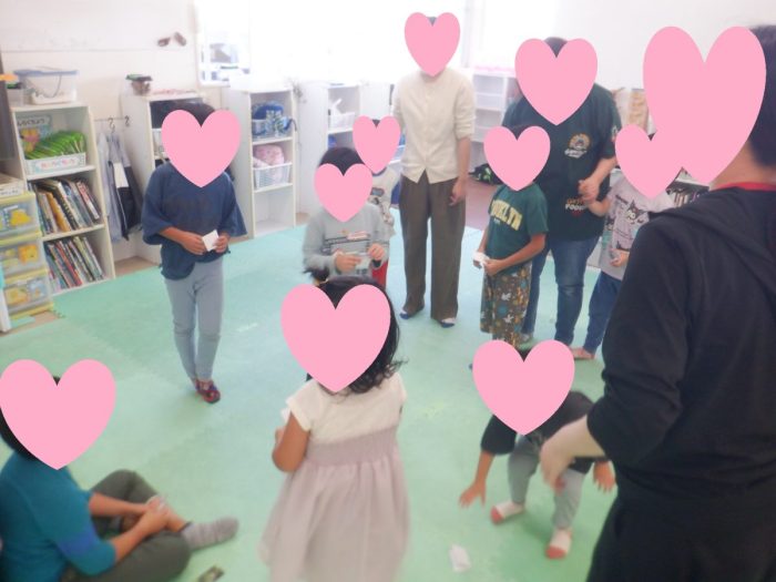 一人ひとりスタッフから渡されたカードに書いてある3つの言葉のみで、同じ言葉を書いてあるお友達を見つけるというゲームです。