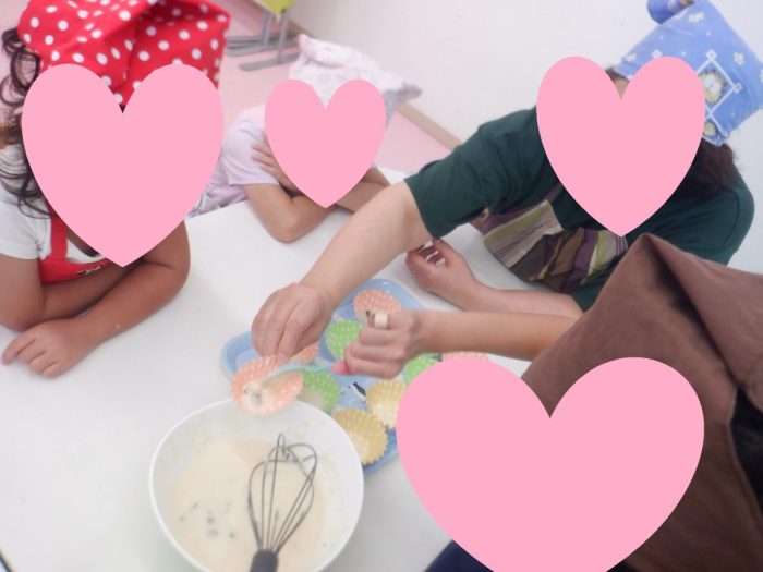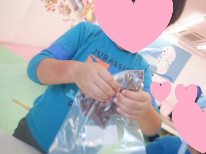 チョコレートを細かく砕き、蒸しパンミックスに混ぜカップに入れる作業を、グループのお友だちと協力しあいながら作りました☺