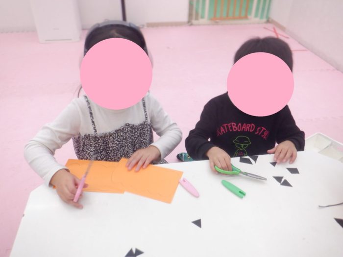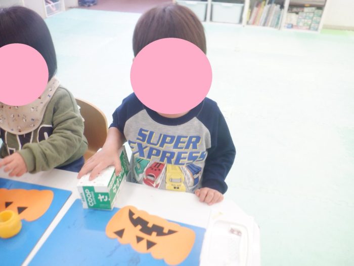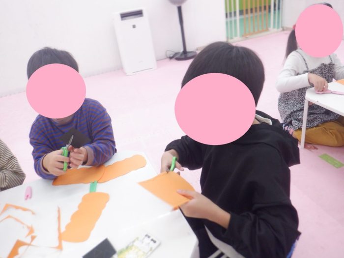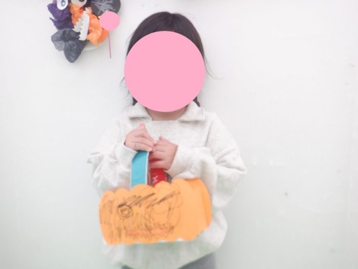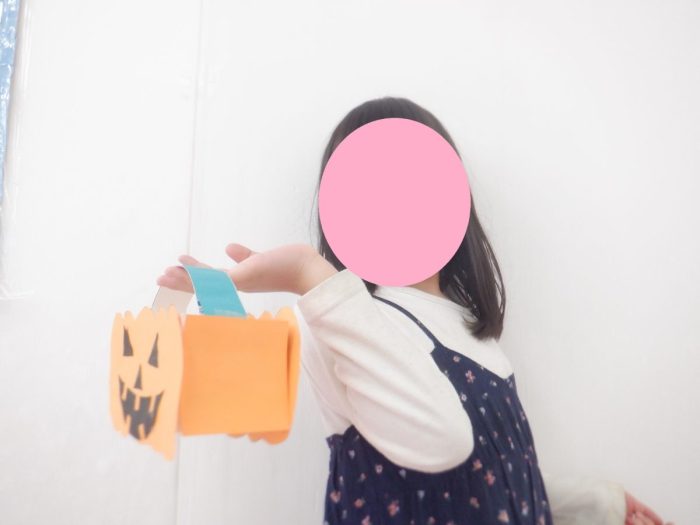 カボチャのお顔を切り、目やお口のパーツを糊で貼りかわいい入れ物が完成しました