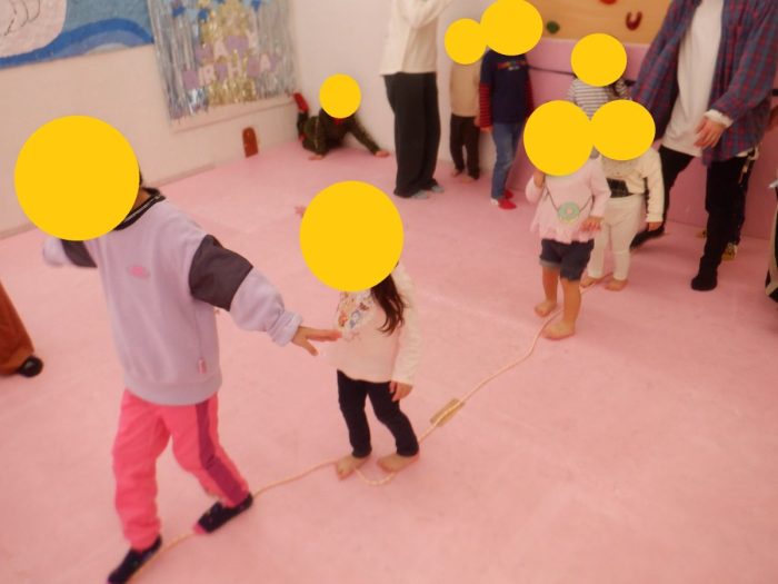 小さい子チームはまず縄になれる所から。縄の上を歩いたり、両足でジャンプしています