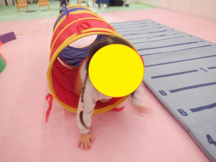 サーキット遊びでは平均台、トンネル、マットの上でゴロゴロ自分で転がることにチャレンジ!
