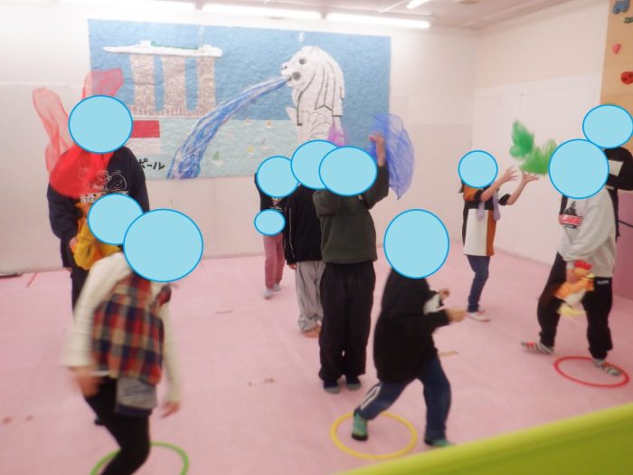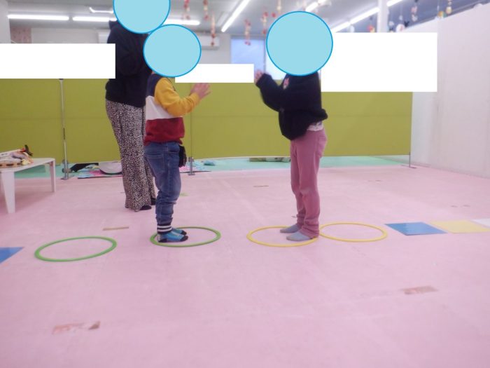 リトミックではリズムジャンプ、フープやスカーフ使った活動を行っています!