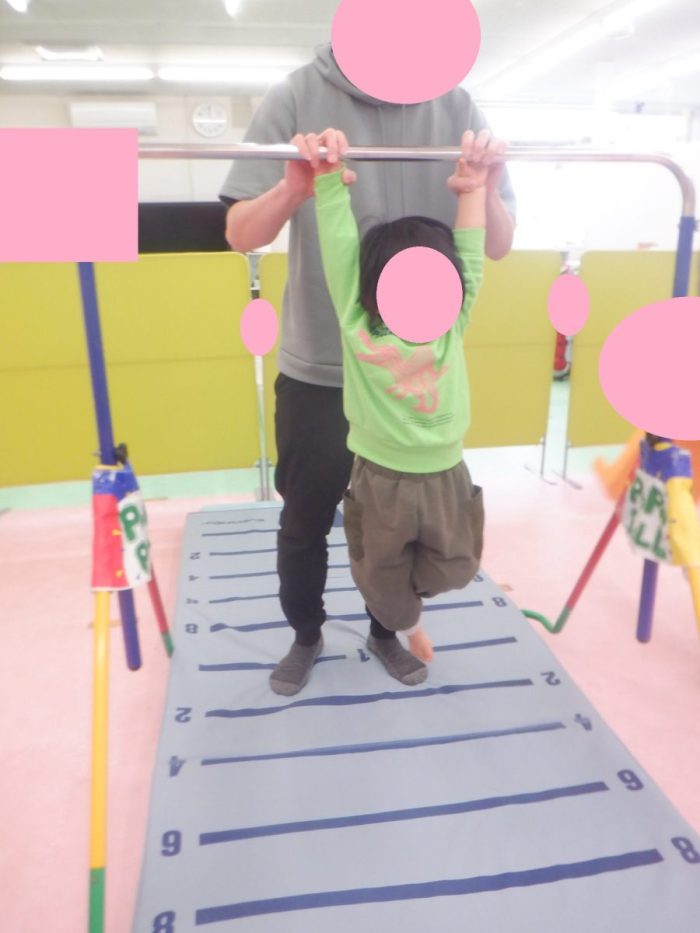 両腕に力を入れしっかりと鉄棒をつかみ、ぶらさがりや前回りなどスタッフの話をしっかりと聞きながら