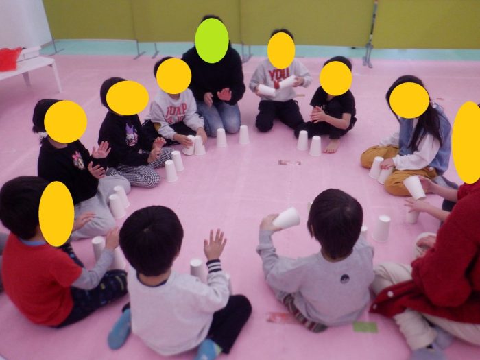 小さい子チームはスカーフやボールを使ったリズム遊び、大きい子チームはフープやコップを使ったリズム練習をしています![]()