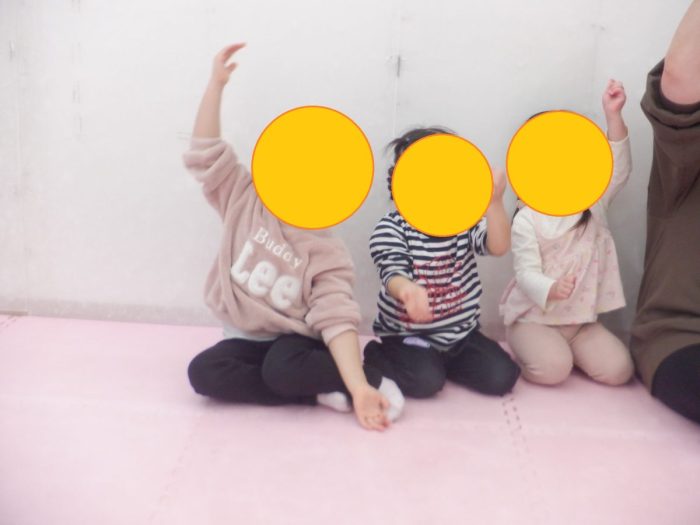 小さい子チームはスカーフやボールを使ったリズム遊び、大きい子チームはフープやコップを使ったリズム練習をしています![]()