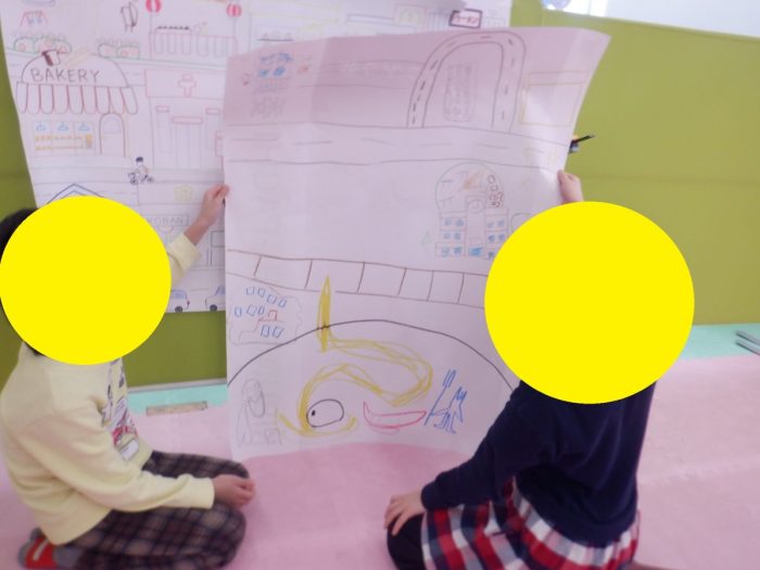 大きい子チームは「街を作ろう!」という課題の二回目でした!今回は道路もそれぞれ描いてもらいました!