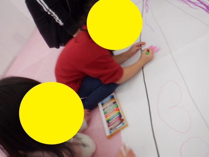 小さい子チームは「パフェを作ろう!」ということで自由にクレヨンでチョコやアイスなどのトッピングを描いたり、