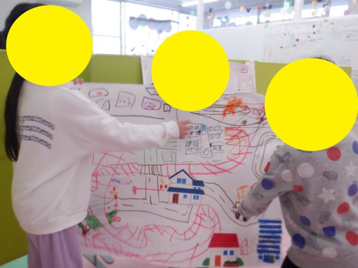 大きい子チームは「街を作ろう!」という課題の二回目でした!今回は道路もそれぞれ描いてもらいました!