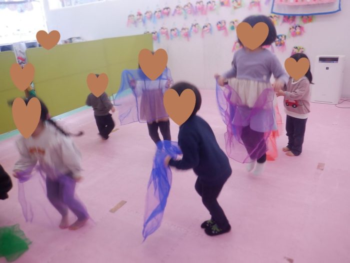 午後からは、リトミックで、手遊びや、スカーフ、カップなどを使ってリズムに合わせて元気いっぱいに活動することが出来ました!