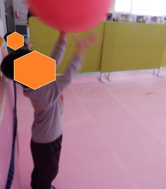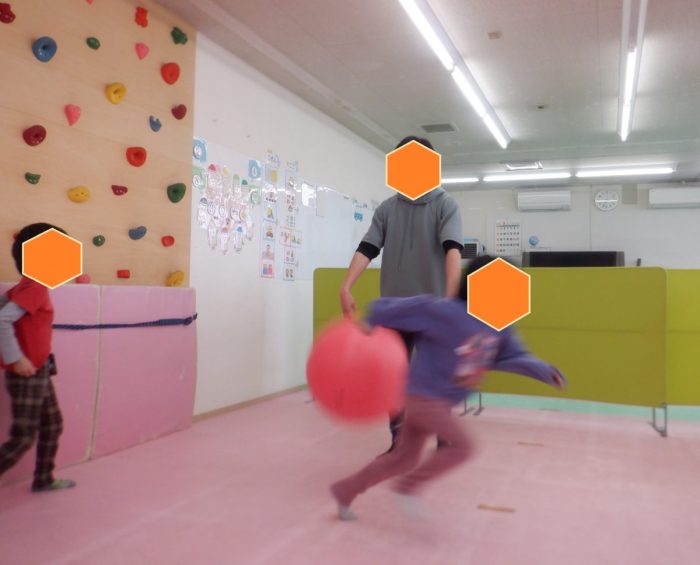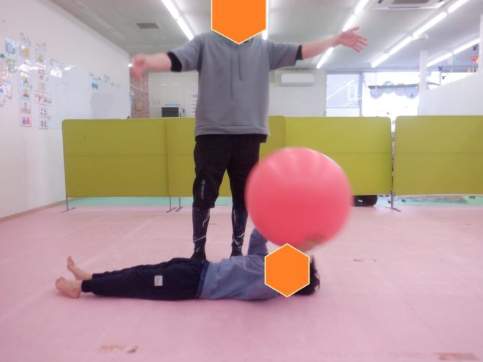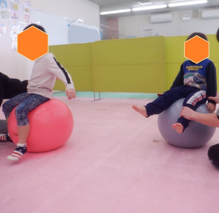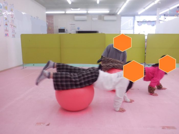大きい子チームはバランスボールを叩いたり、寝てキャッチしたりと、
