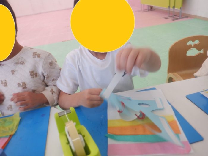 カラフルな花紙を使用して「混ぜたら何色になるかな?」というクイズをしたり、工作では指先の運動や指先の力を促した工作を行っています🌈
